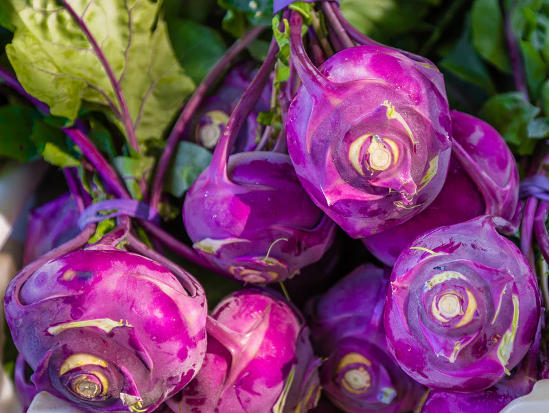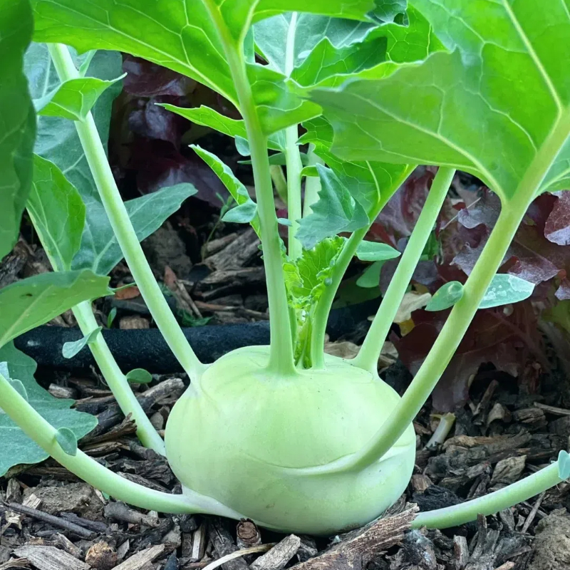 Mature Kohlrabi: Best harvested at tennis ball size (8-12 weeks) to avoid woodiness.