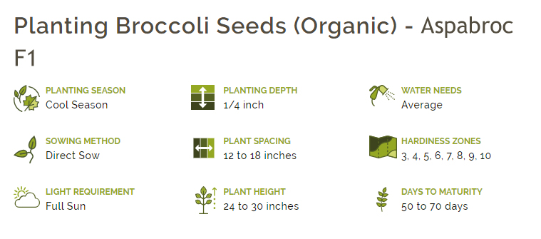 Asprabroc is a fine crop for spring or fall. It is not as frost-tolerant as traditional heading broccoli might be, but in fall it can be grown right up to hard frost or placed in a cold frame. It is an excellent performer in spring. This plant reaches about 20 to 24 inches high, and should be spaced about 8 to 10 inches apart in the garden. Suitable for containers too, of course.