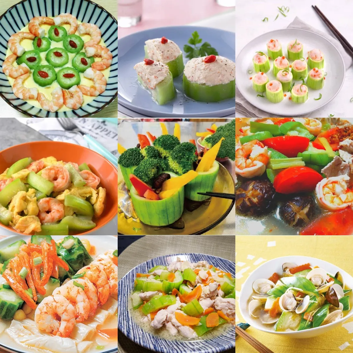 Steamed Sponge Gourd with Seafood: Cut the sponge gourd into segments, add shrimp or scallops, and steam with light soy sauce. The result is a sweet and savory flavor.
